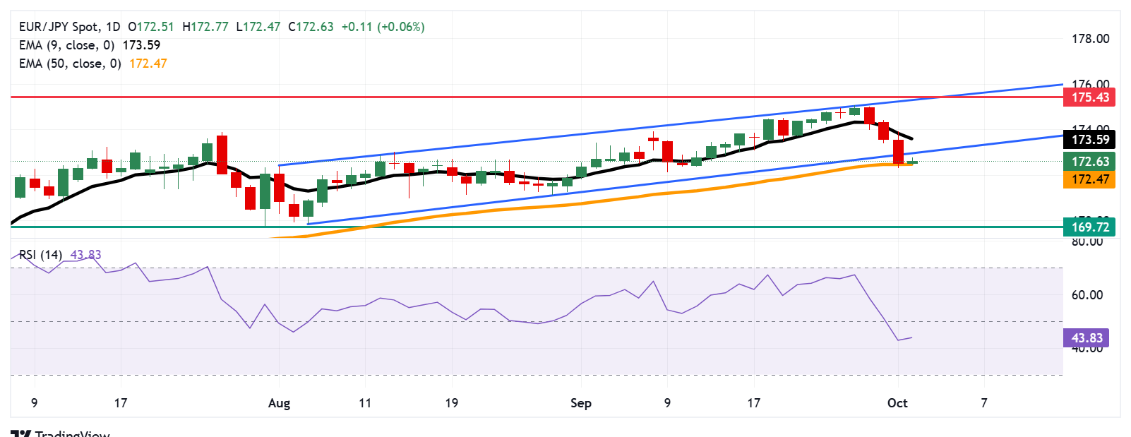 欧元/日元在周四亚洲时段停止了连续三天的下跌,交易价格约为172.60。日线图的技术分析显示,货币交叉从看涨偏向转为看跌偏向,因为该货币交叉略微位于上升通道模式下方。