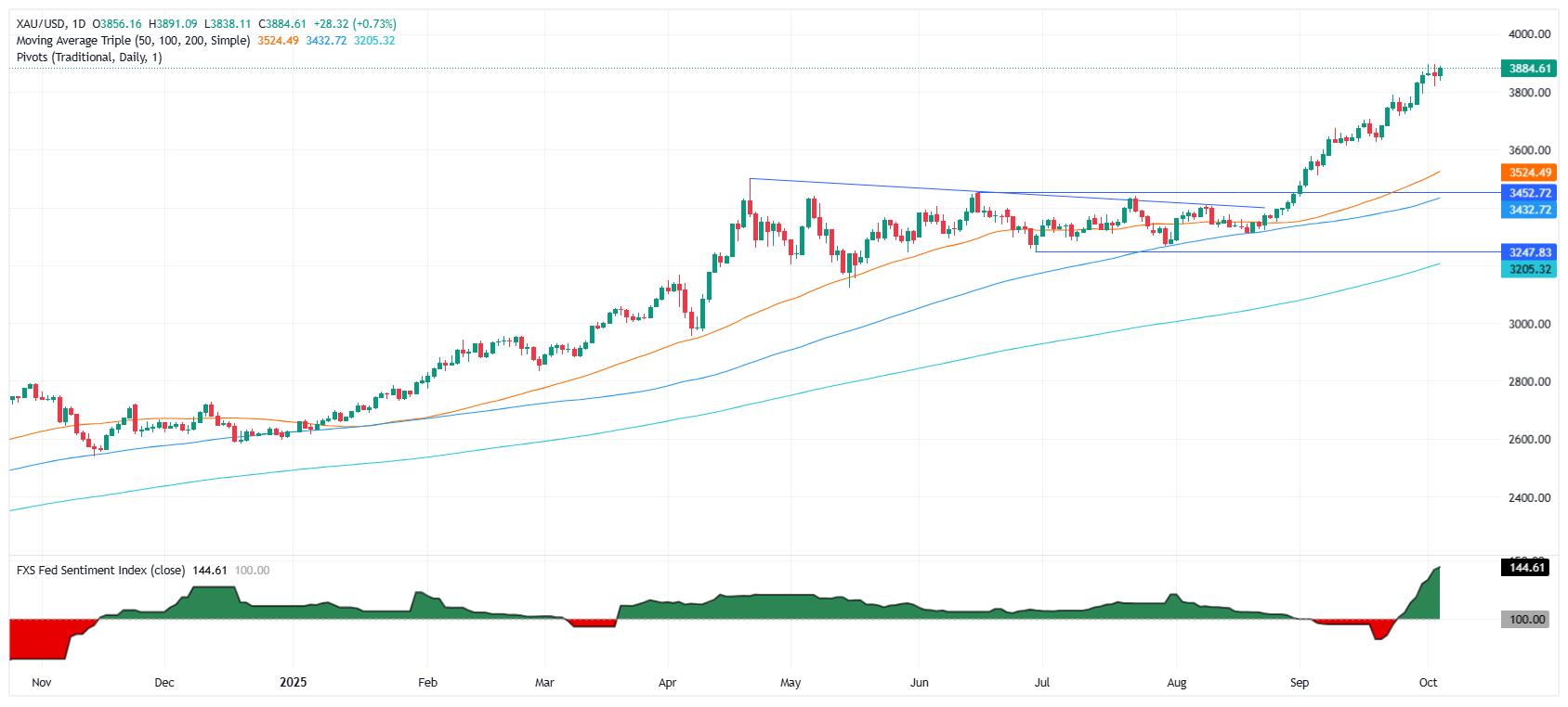 金价在周五北美时段上涨,日内上涨0.70%,因美国政府停摆延续至第三天,预计将连续第七周以积极的姿态结束本周。撰写时,黄金/美元交易于3,882美元,之前触及日低3,838美元