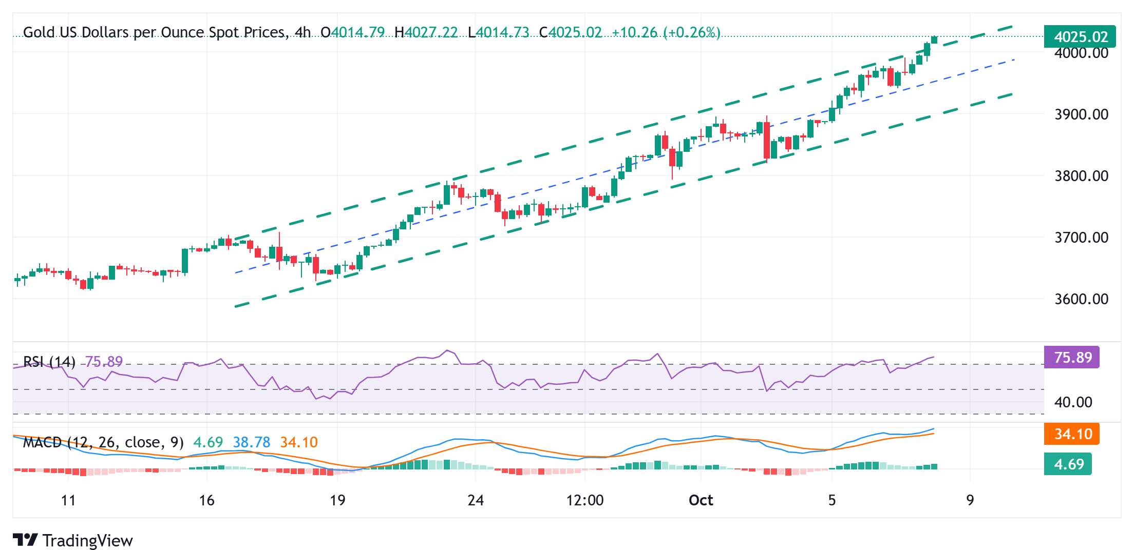 黄金(黄金/美元)延续近期强劲上涨,周三在进入欧洲时段时攀升至约4,037美元的新历史高点