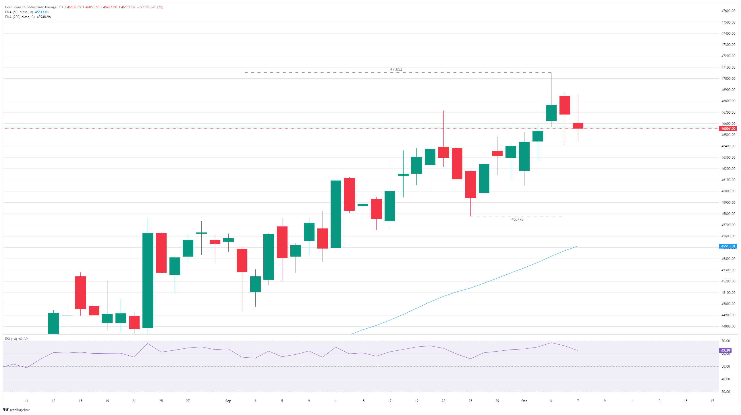 道琼斯工业平均指数(DJIA)在周二下跌,跟随大盘走低。投资者正在重新考虑他们对美国政府停摆的漠视,该停摆已进入第二周,并且没有解决的迹象。