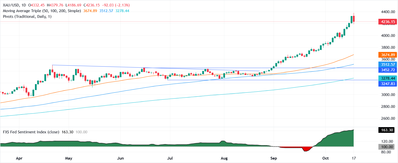 黄金价格(XAU/USD)在周五早些时候创下 4,379 美元的历史高点后下跌 2%,跌至 4,250 美元以下,原因是美国总统唐纳德·特朗普评论称对中国征收三位数关税是不可持续的。撰写本文时,贵金属价格徘徊在 4,230 至 4,240 美元区间。