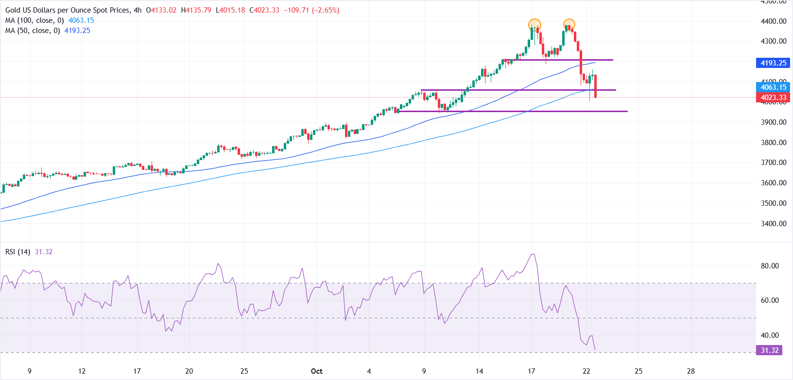 黄金(黄金/美元)在经历了前一天的剧烈抛售后,试图在周三稳定下来,随着美元(USD)的走软,找到了一些支撑。截至发稿时,黄金/美元交易在约4040美元,较早前短暂跌至4004美元,跌幅超过1.50%。
