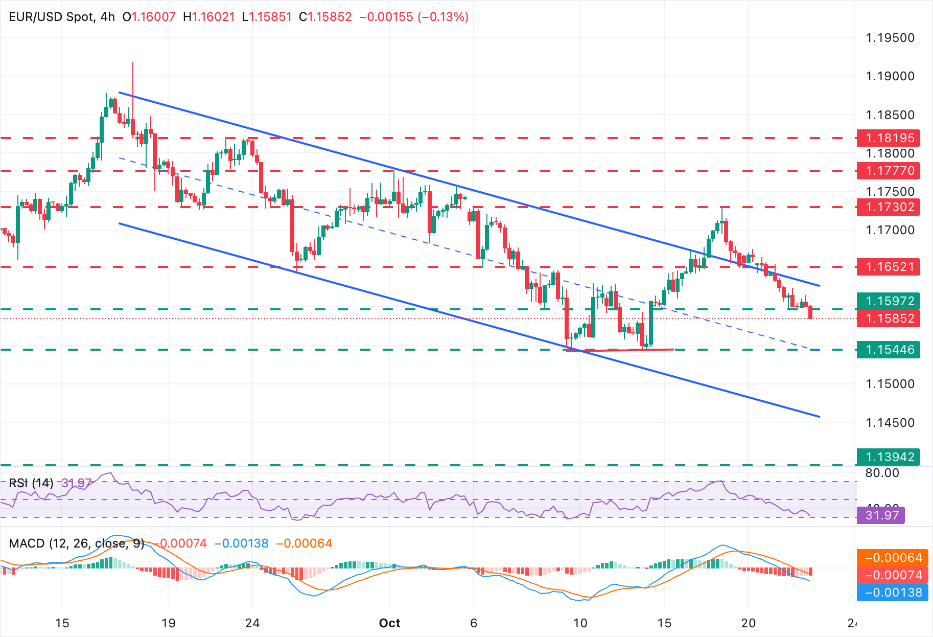 欧元/美元在周三回撤之前的涨幅,延续其跌势至一周低点,跌破1.1600,写作时交易于1.1586。美元(USD)在早期欧洲交易时段恢复上涨趋势,市场在等待欧洲央行(ECB)和美联储(Fed)官员稍后发表的讲话时保持谨慎情绪。在周二,美国总统唐纳德·特朗普拒绝了民主党立法者前一天的会面请求,表示在政府重新开放之前不会与他们会面。与此同时,停摆进入第四周,参议院在周一第11次未能通过资金决议。 标题:欧元/美元延续跌势,关注欧洲央行行长拉加德和美联储官员讲话