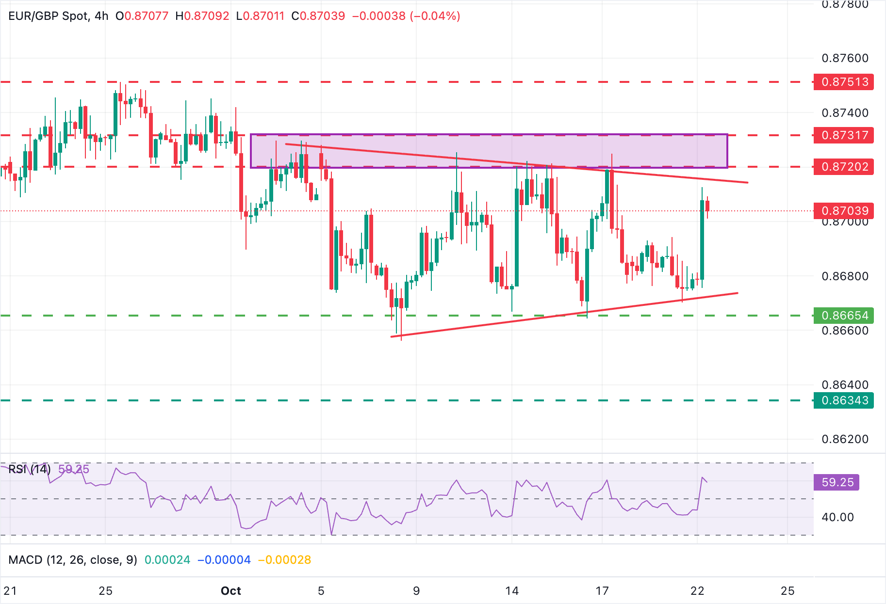 周三早些时候,欧元在英国通胀数据低于预期后,因英镑疲软而跳升至0.8700以上的周内高点。然而,该货币对仍在一个80点的区间内波动交易,走势颠簸且不稳定。9月份的英国消费者价格在当天早些时候未能达到市场共识。年CPI保持在3.8%的稳定水平,低于预期的4%的加速,这增强了市场对英国央行可能在年底前再次降息的希望。 标题:欧元/英镑价格预测:随着英镑下跌,重回0.8700上方
