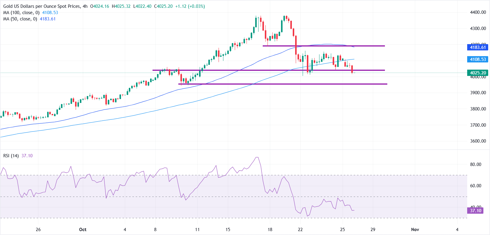 黄金(黄金/美元)以负面基调开启本周,因风险偏好改善抑制了对避险资产的需求。撰写时,黄金/美元交易约为3985美元,下跌近3%,延续了上周创下4381美元纪录高点后的回撤,因贸易谈判进展引发了一波获利了结。
