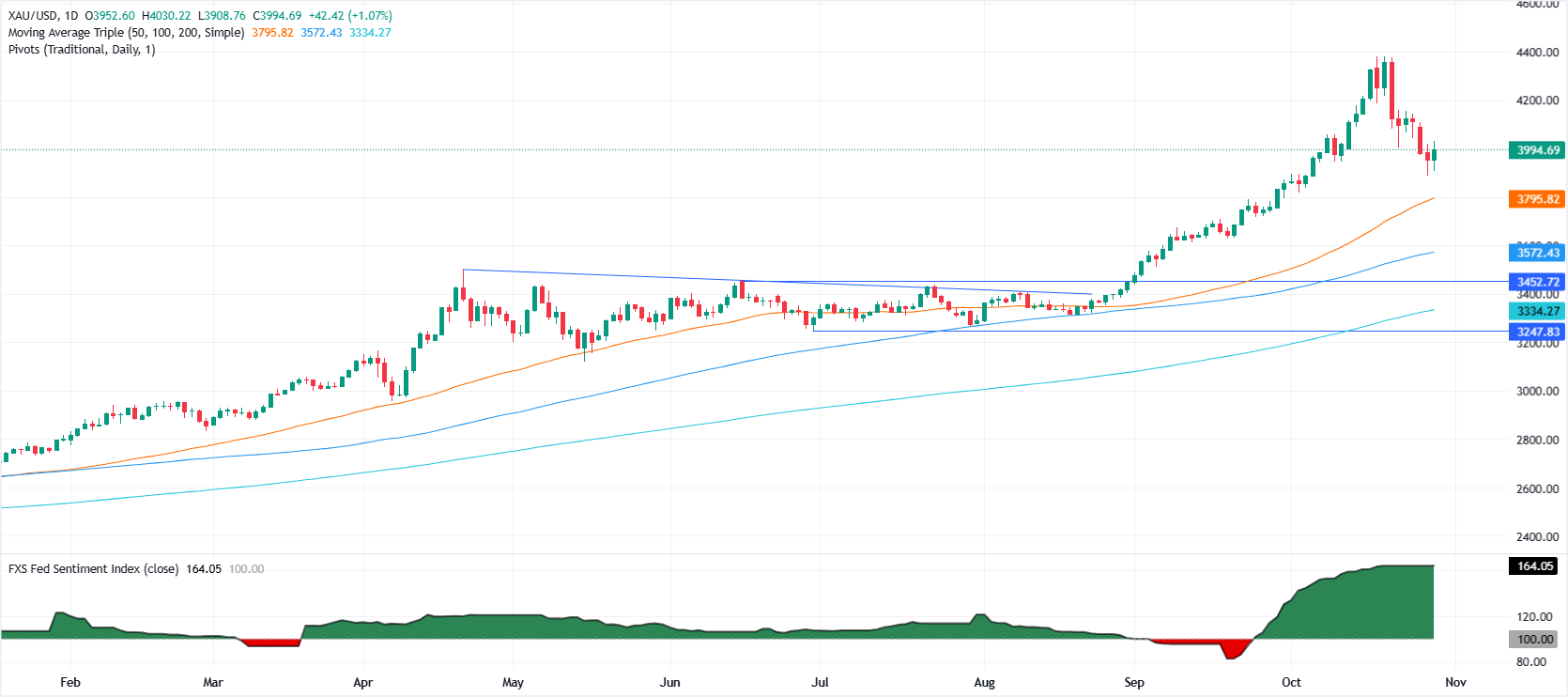 金价上涨,因为美联储(Fed)决定如预期在周三将利率下调25个基点,尽管并非全体一致。在撰写本文时,黄金/美元在3,990至4,010美元区间内波动,交易商正为美联储主席杰罗姆-鲍威尔的新闻发布会做准备