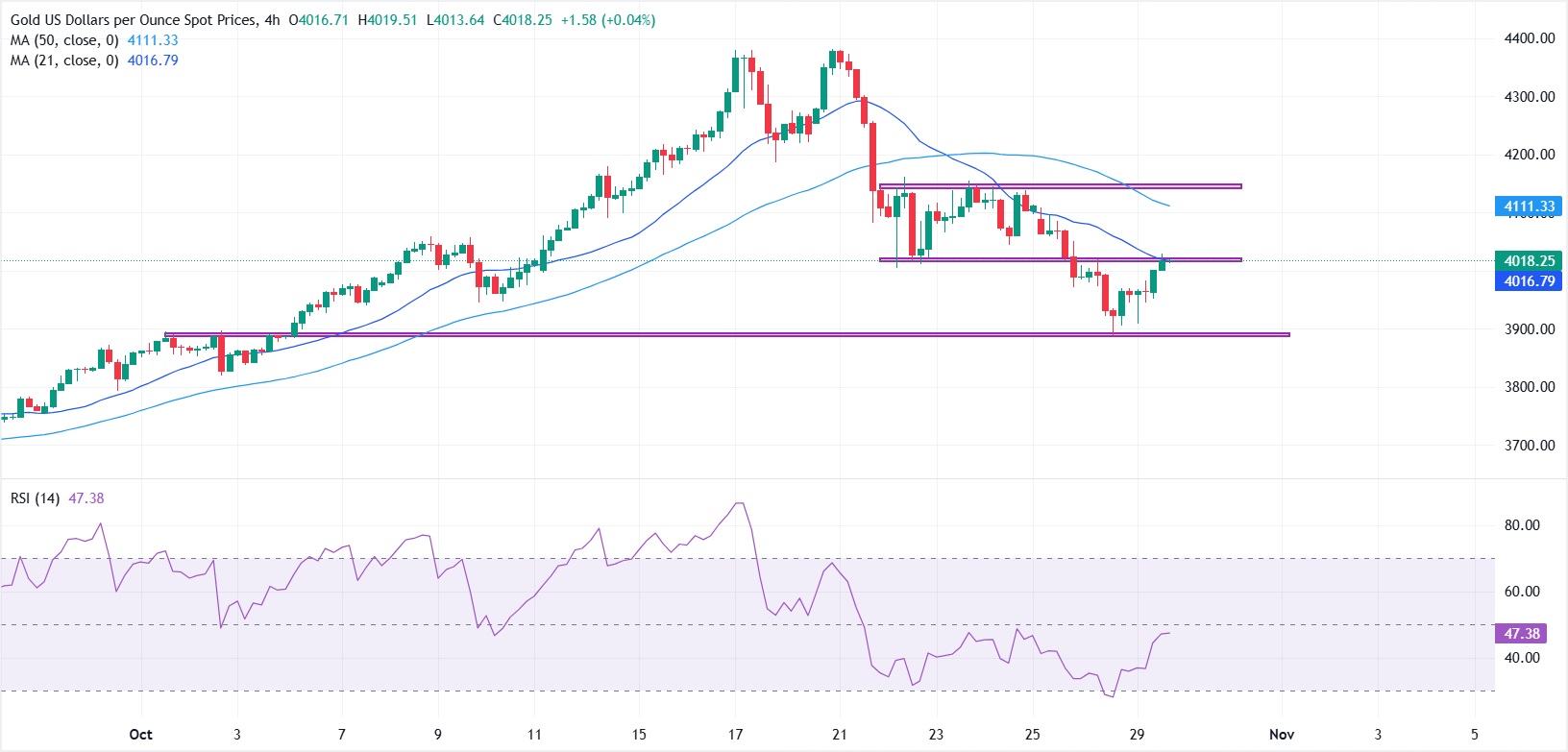 黄金(黄金/美元)在周三小幅反弹,此前周二曾短暂下滑至3886美元附近的三周低点。随着交易者在美联储(美联储)于GMT时间18:00公布利率决议前谨慎调整头寸,反弹随之而来