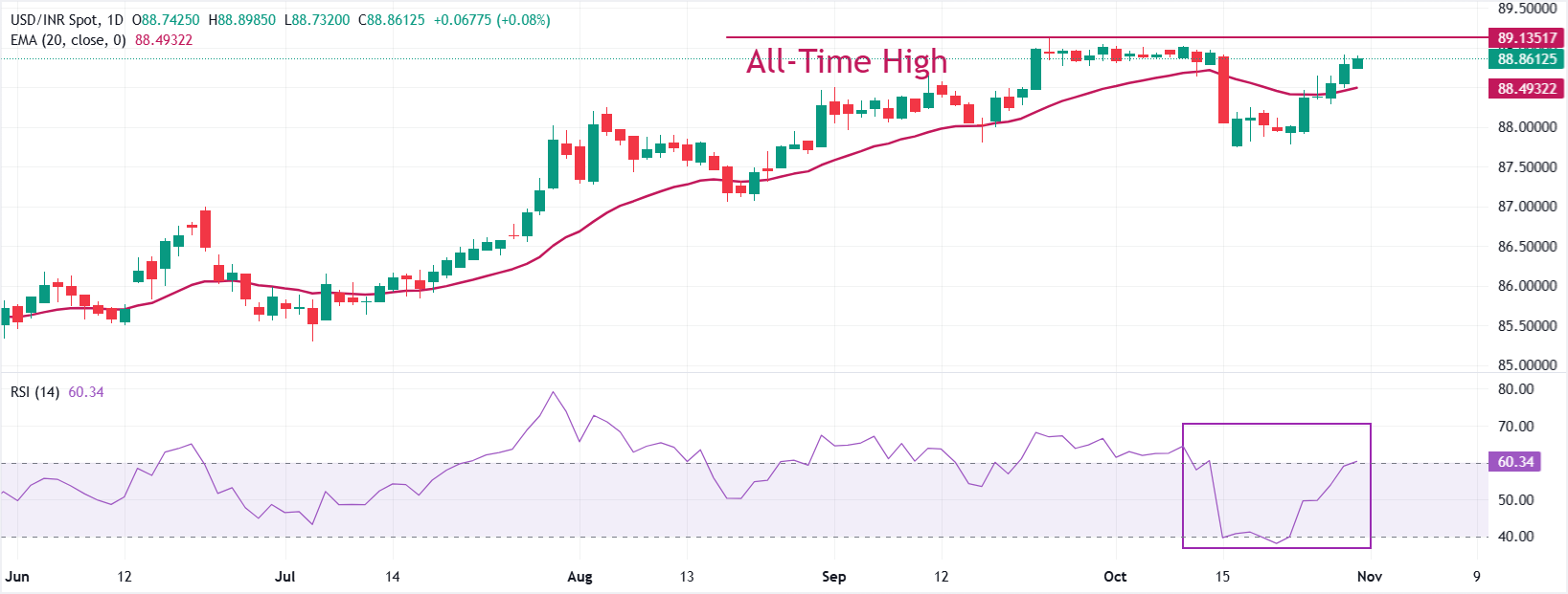 印度卢比(INR)在周五平开后兑美元(USD)走低。美元/印度卢比对上涨至88.90附近,因为美元(USD)因美联储(Fed)鸽派押注减弱以及美国(US)与中国之间贸易关系改善而普遍走强。