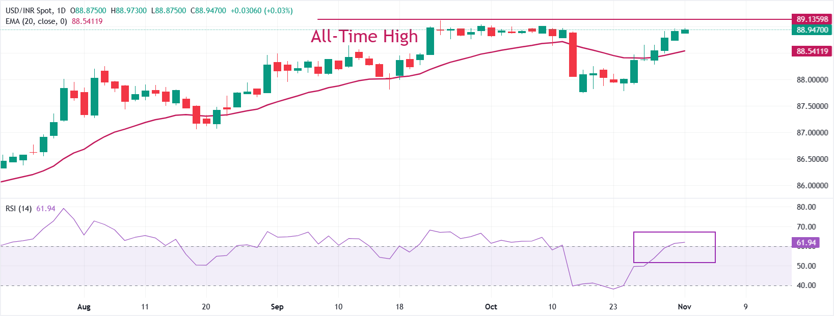 印度卢比(INR)在新月的开始于周一以平稳的姿态开盘,接近其两周多来的高点约为88.95。美元/印度卢比(USD/INR)旨在延续其六天的上涨趋势,因为印度卢比(INR)因外国机构投资者(FIIs)在印度股市的抛售而继续表现不佳,而美元(USD)在美联储(Fed)对12月政策会议进一步降息的疑虑加剧的情况下延续其反弹。 标题:美元/印度卢比表现出强劲,因为美元持续优于其他货币