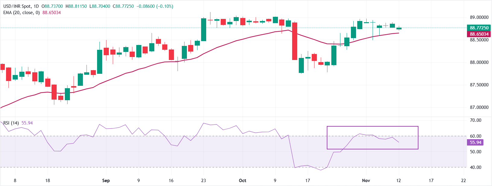 印度卢比(INR)在周三面临对美元(USD)的卖压。由于印度卢比表现不佳,美元/印度卢比(USD/INR)对接近88.80,市场在等待印度10月消费者物价指数(CPI)数据的发布,时间为GMT10:30。