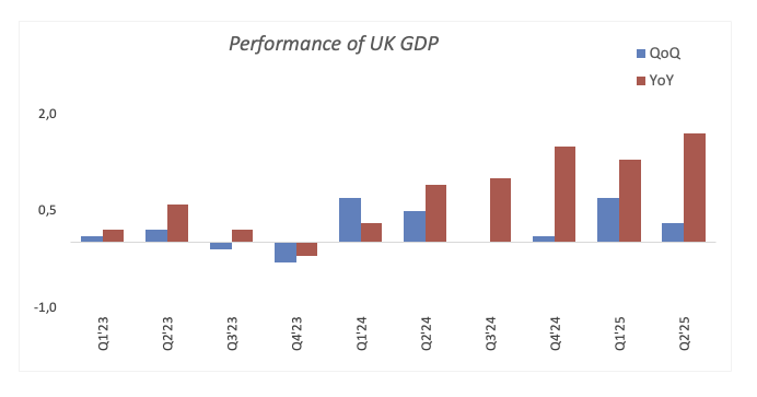 标题:突发:英国2025年第三季度初步国内生产总值(GDP)环比增长0.1%,预期为0.2%