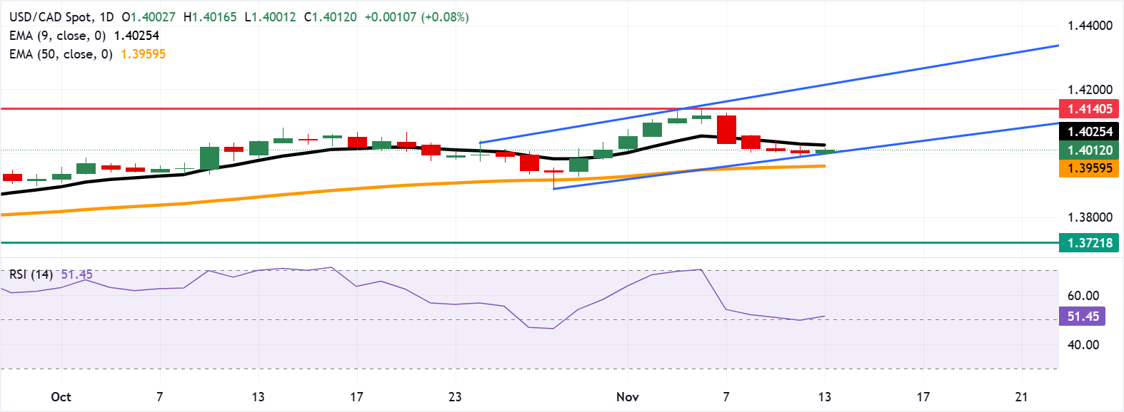 美元/加元在连续四天下跌后走高,周四亚洲时段交易约为1.4010。日线图的技术分析显示出明显的看涨偏向,该货币对仍处于上升通道形态内