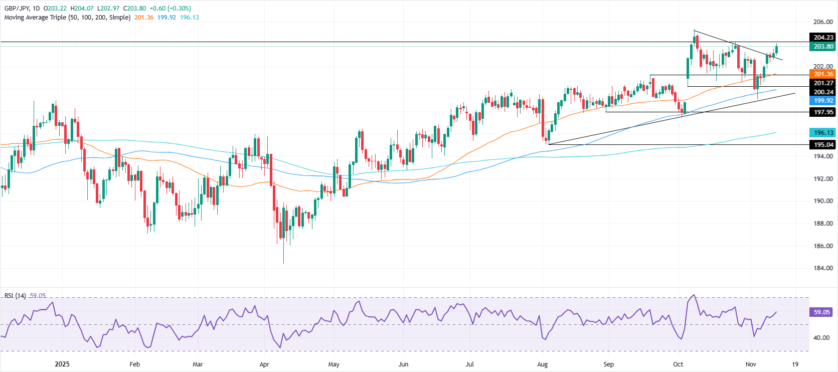 周四,英镑/日元延续涨势,微涨0.22%,远离20日简单移动均线(SMA)202.48,该均线被视为该交叉盘的首个支撑区域。撰写时,该交叉盘交易于203.82,距离重新夺回204.00的里程碑尚有一段距离。