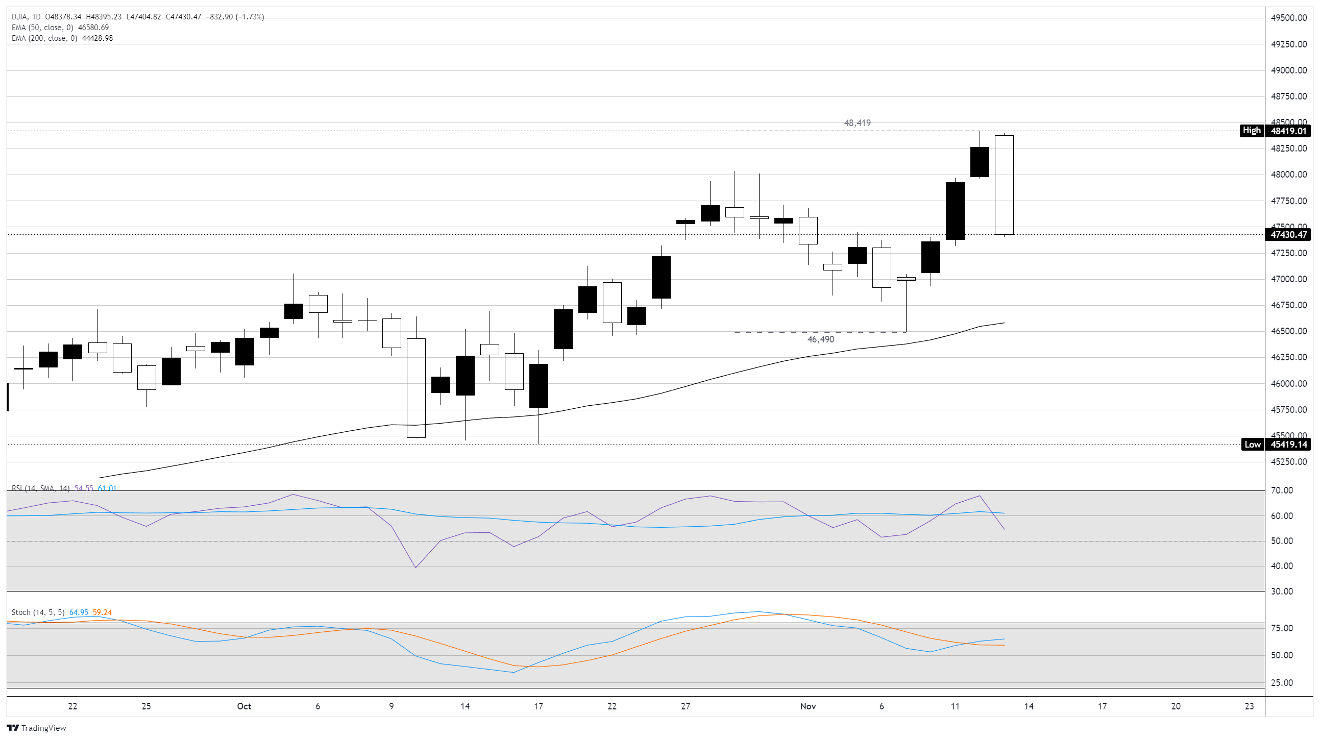道琼斯工业平均指数(DJIA)在周四大幅回落,最低下跌约850点,远离周中市场交易时创下的历史高点