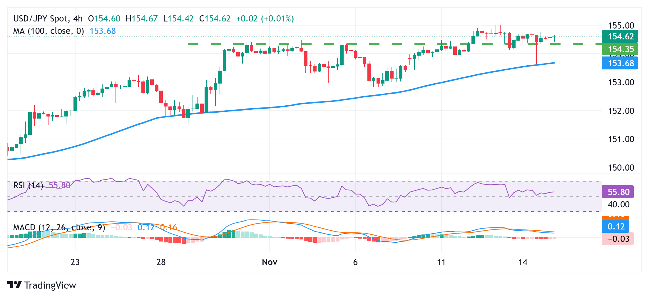 日本央行(JPY)在周一早盘的欧洲时段中,面对普遍走强的美元(USD)保持其卖盘基调,并接近上周触及的九个月低点。今天早些时候发布的政府数据显示,日本经济在7月至9月期间首次出现六个季度的收缩。这是在日本首相高市早苗的财政刺激计划和对超宽松货币政策的支持背景下,削弱了市场对日本央行(BoJ)加息的押注,并削弱了日元(JPY)。另一方面,美元受益于市场对美联储(Fed)在12月再次降息的押注减少,帮助美元/日元(USD/JPY)维持在154.45-154.50的阻力区上方。 标题:日元持续疲软;美元/日元在更强美元的推动下接近九个月高位