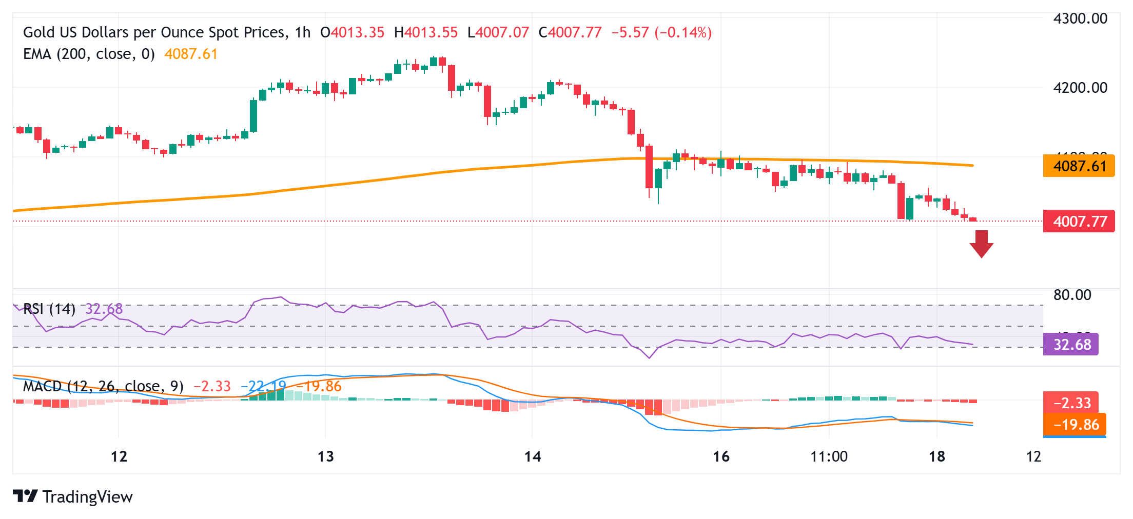 黄金价格接近4000美元;在美联储降息押注减少的情况下,似乎在一周低点附近显得脆弱