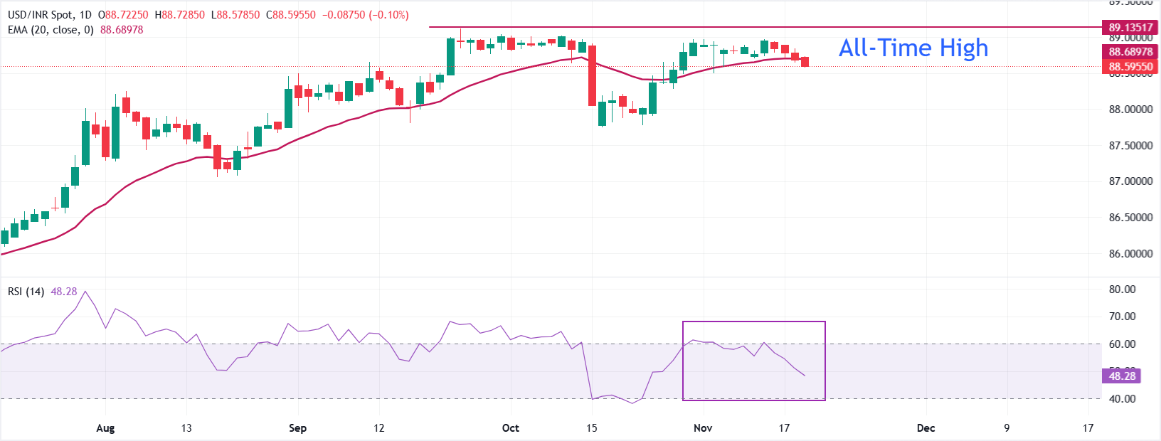 印度卢比(INR)在周三延续了对美元(USD)的上涨势头,已连续第四个交易日上涨。美元/印度卢比跌至接近88.60,因为印度货币在美国(US)和印度可能很快宣布贸易协议的预期不断增强的情况下保持了整体坚挺。