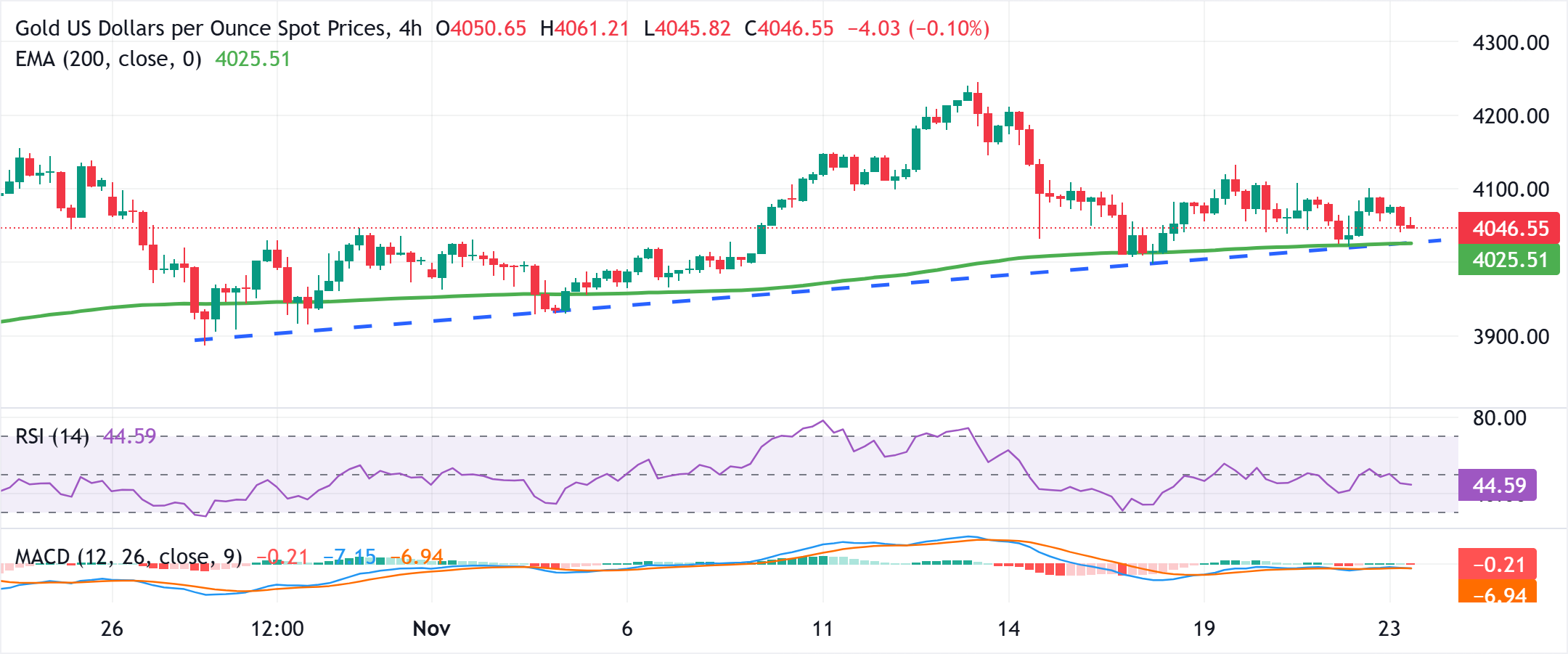 黄金(黄金/美元)在周一早盘欧洲时段维持其卖压,尽管缺乏持续性,目前交投于4050美元上方,日内下跌0.35%