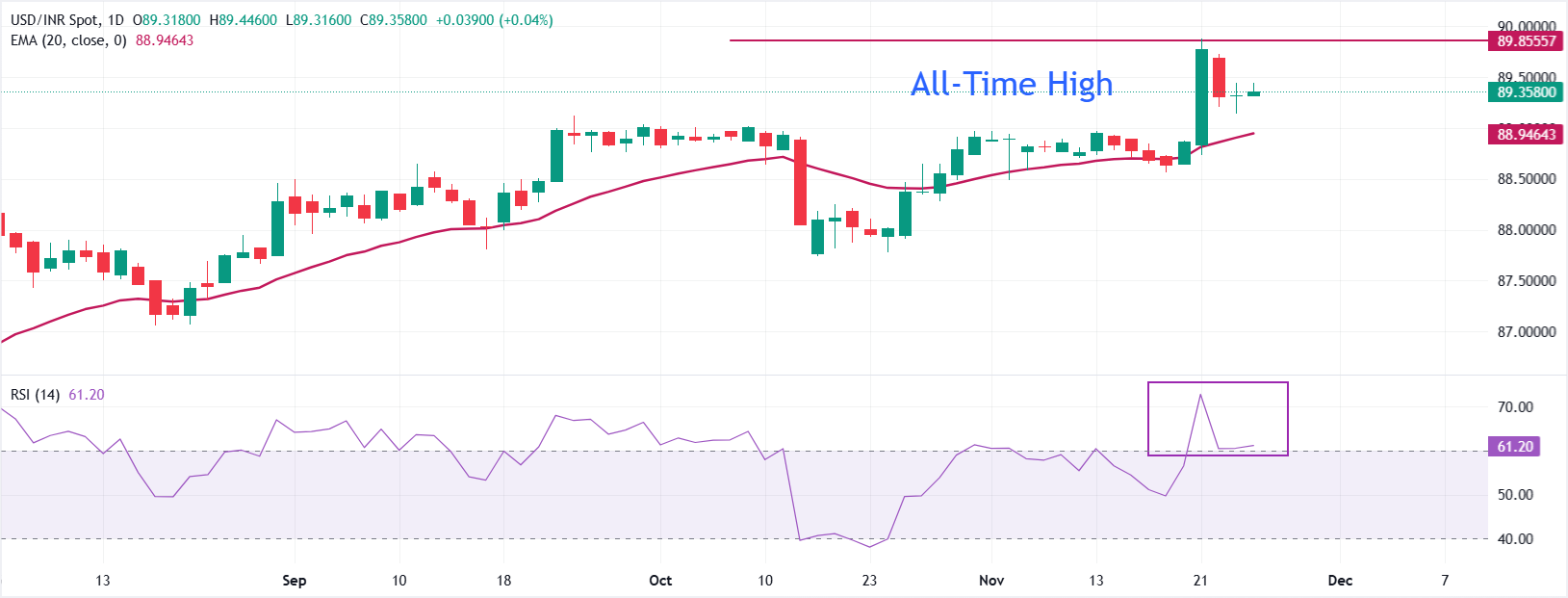 印度卢比(INR)在周三对美元(USD)开盘时小幅走低。美元/印度卢比(USD/INR)接近89.35,印度卢比继续表现不佳,因印度进口商和离岸市场对美元的持续需求。