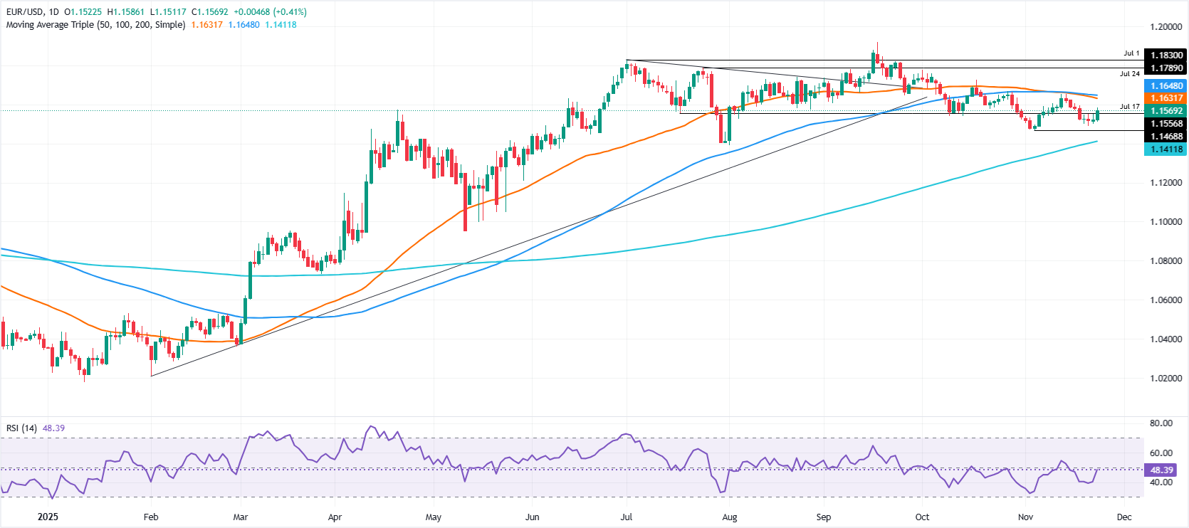 欧元/美元周二录得超过0.51%的稳健涨幅,受到美元疲软的提振,数据强化了交易员对美联储可能在12月会议上降息的猜测。截至发稿时,该货币对交易于1.1579,接近1.1600的整数关口。