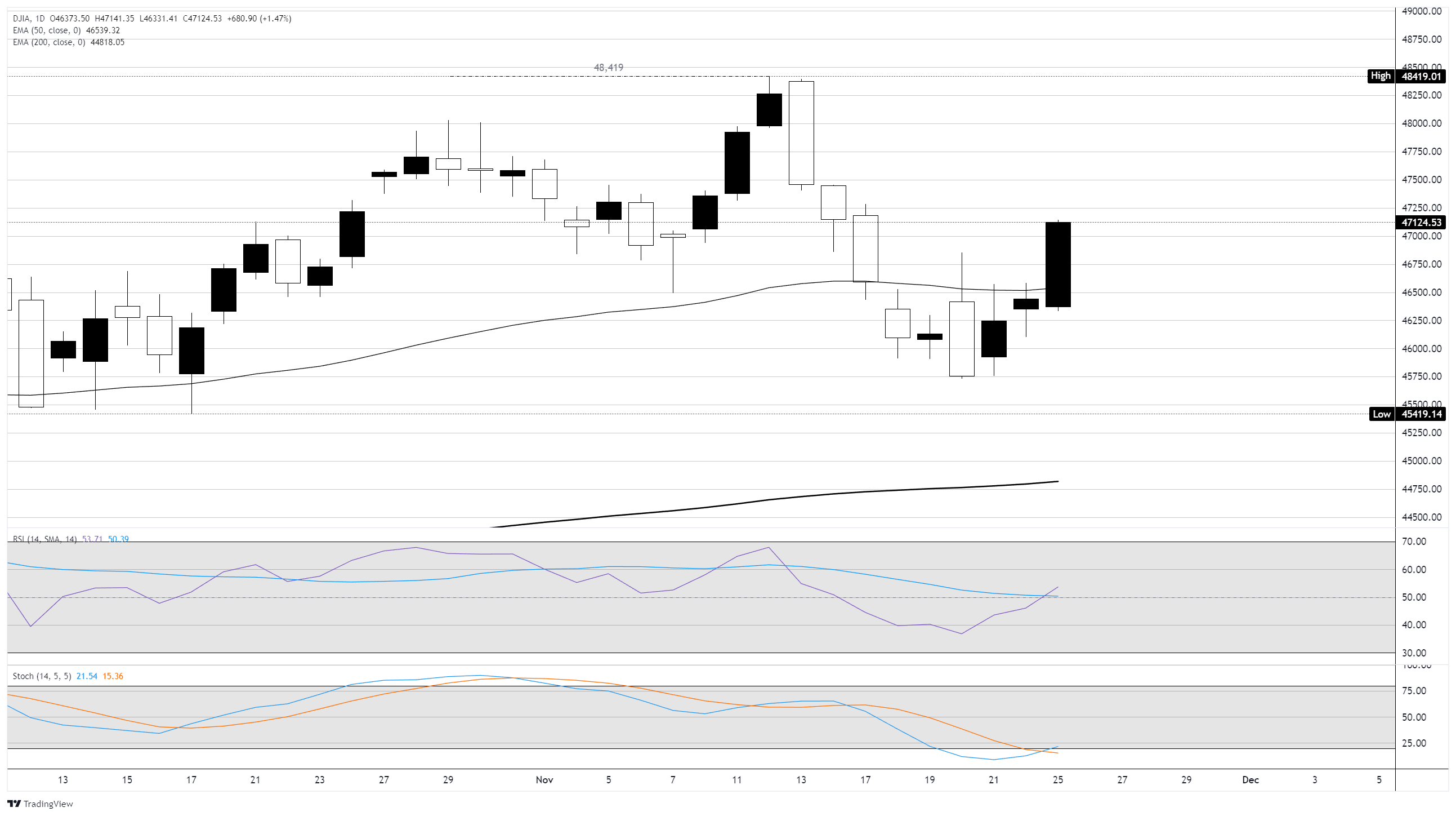 道琼斯工业平均指数(DJIA)周二波动上涨超过550点,从早期的波动中反弹,投资者在相互矛盾的头条新闻中应对挑战。市场最终在假期缩短的交易周中稳定下来,呈现出看涨的倾向,但关键科技股仍在拖累引领上涨的人工智能板块。