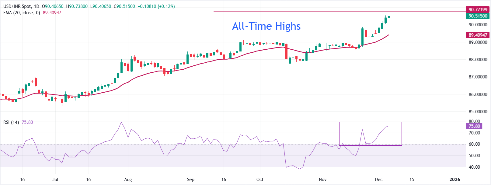 印度卢比(INR)在周四连续第七个交易日对美元(USD)大幅下跌。美元/印度卢比在开盘时创下约90.70的新历史高点,因为印度卢比因外国资金持续流出印度股市而面临压力。