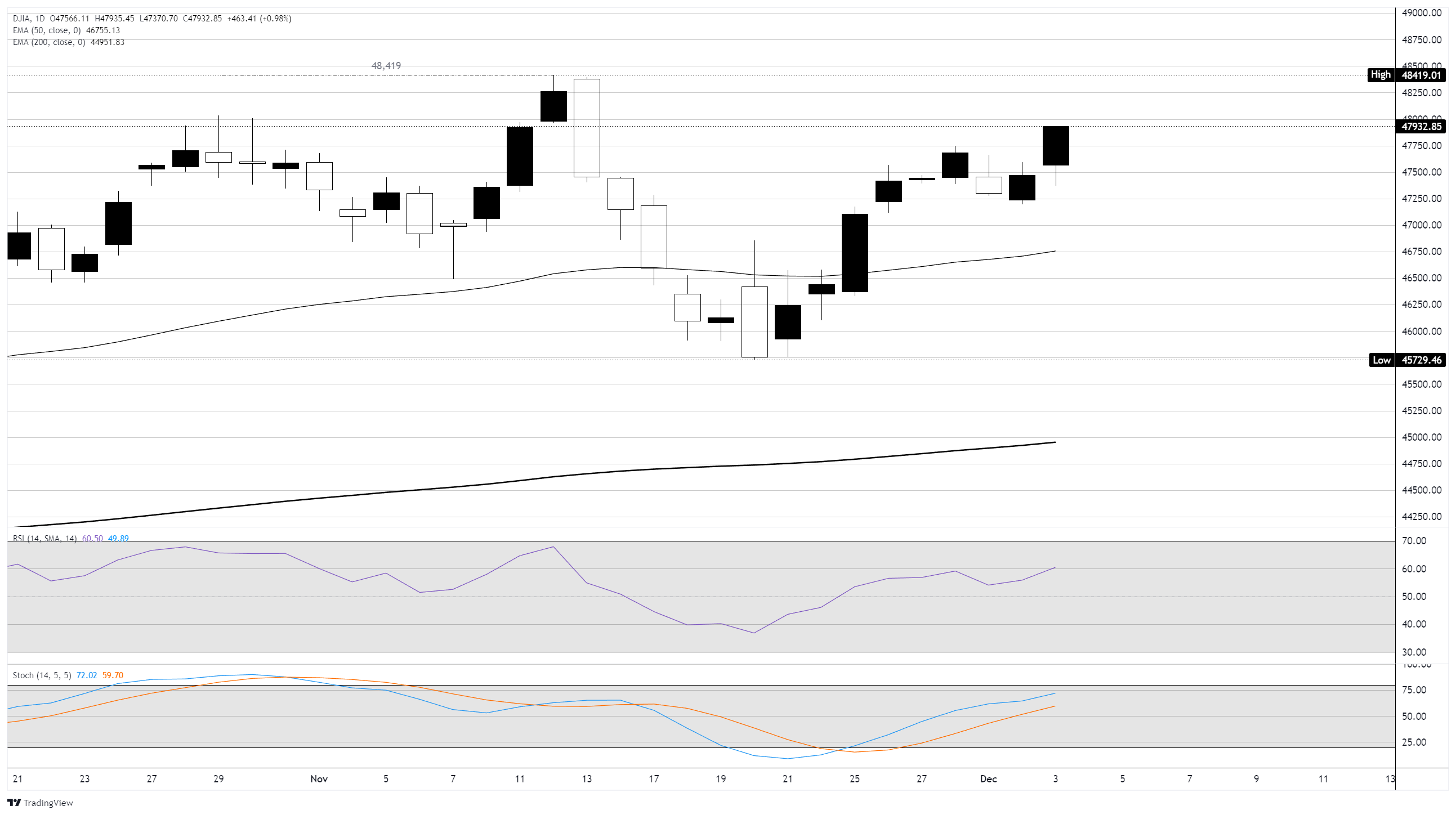 道琼斯工业平均指数(DJIA)周三上涨420点,市场对美国经济表现不佳的乐观情绪重新升温,推动美联储(Fed)被迫在12月进行第三次连续降息。