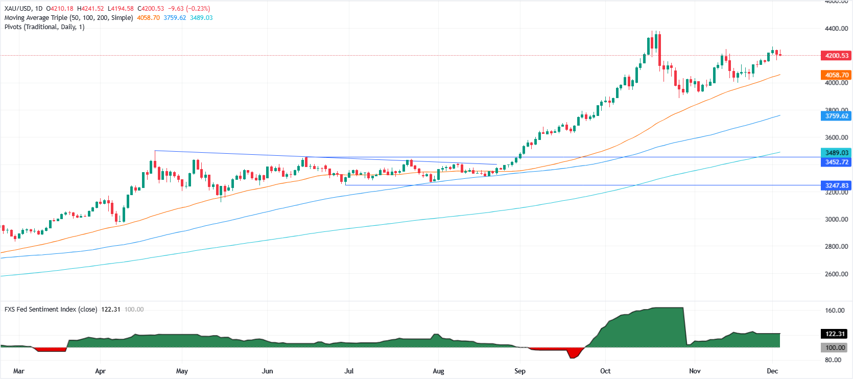 在美元下滑和美联储转向预期增加的背景下,黄金价格徘徊在4200美元附近