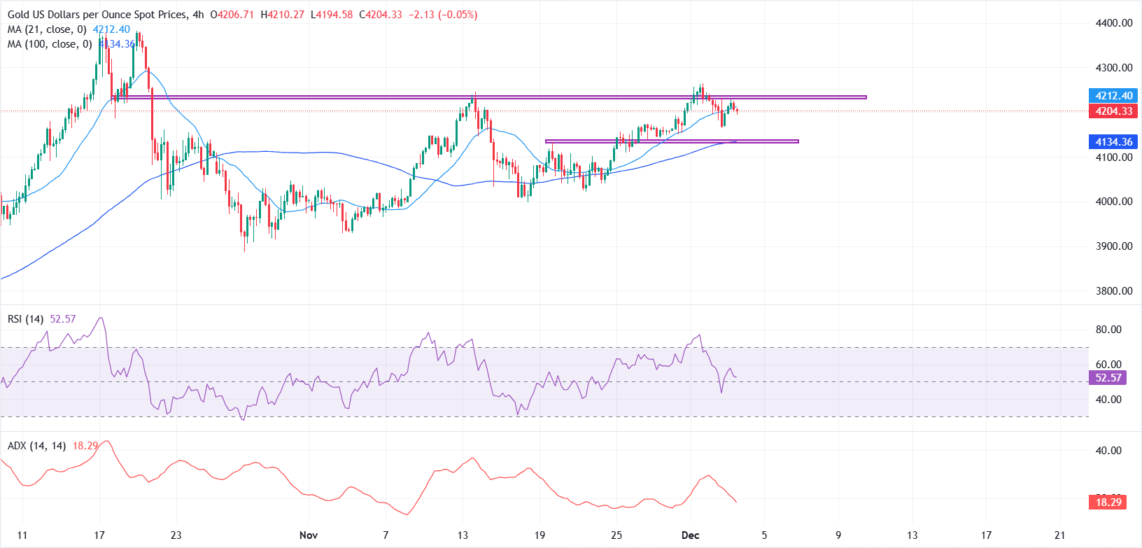 黄金(黄金/美元)在交易员对最新美国经济数据作出反应时走强。撰写本文时,黄金/美元交易价格约为 4225 美元,稍微上涨,此前在当天早些时候曾短暂跌破 4200 美元的心理价位。
