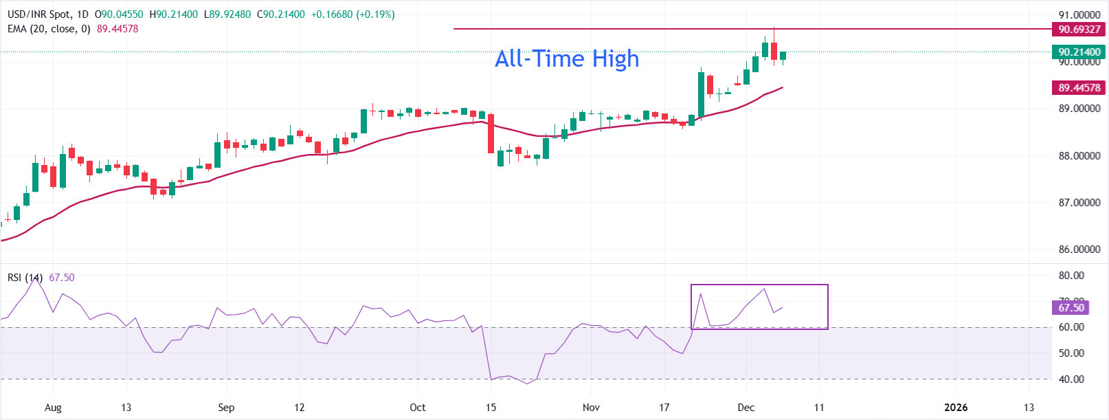 印度卢比(INR)在周五对美元(USD)回落,美元/印度卢比(USD/INR)汇率回升至接近90.25,此前印度储备银行(RBI)发布了鸽派货币政策声明