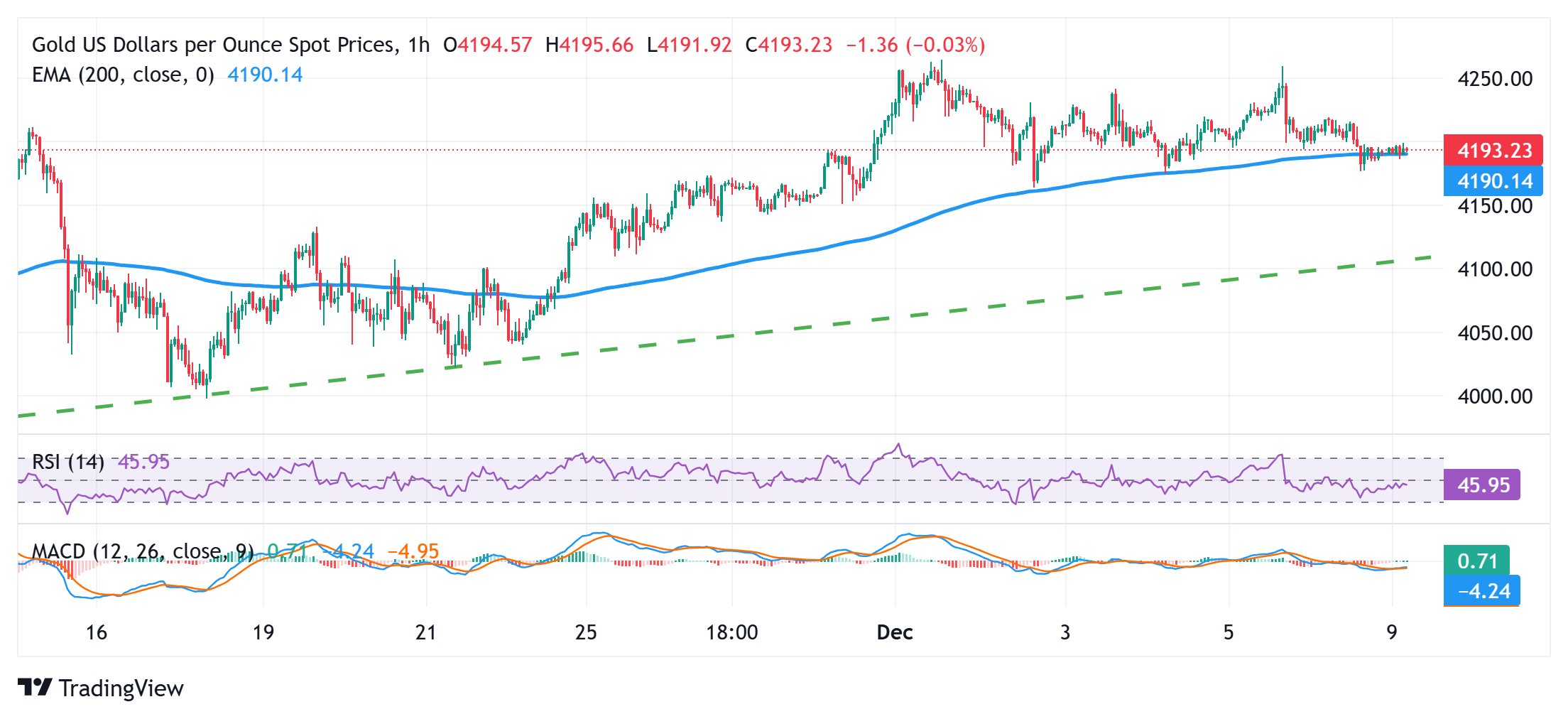 黄金(黄金/美元)连续第三天呈现看跌偏向,在周二早盘欧洲时段跌至一周低点,约在4170美元区域