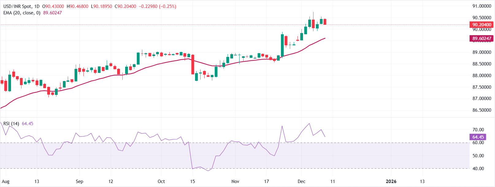 印度卢比(INR)在周二对美元(USD)反弹。美元/印度卢比汇率跌至接近90.20,因外国资金流出印度股市的速度放缓。