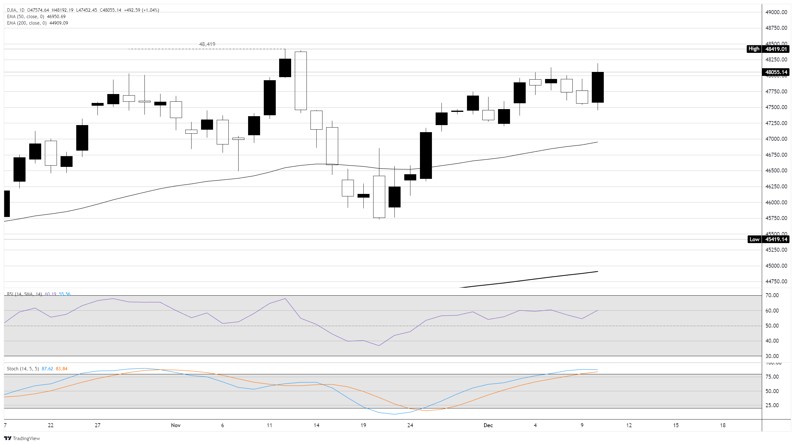 道琼斯工业平均指数(DJIA)在周三上涨,此前美联储(Fed)连续第三次将基准利率下调25个基点,最高时道琼斯上涨超过1.2%,并推动标普500指数上涨,而纳斯达克则维持在平盘附近。此次降息将联邦基金利率降低至3.50%–3.75%,并伴随重新启动短期债券购买,导致2年期国债收益率下降。市场解读美联储对劳动力市场放缓的认可为其可能优先支持就业的信号,即使通胀仍然是一个担忧。 标题:道琼斯工业平均指数大幅上涨,因为美联储连续第三次降息