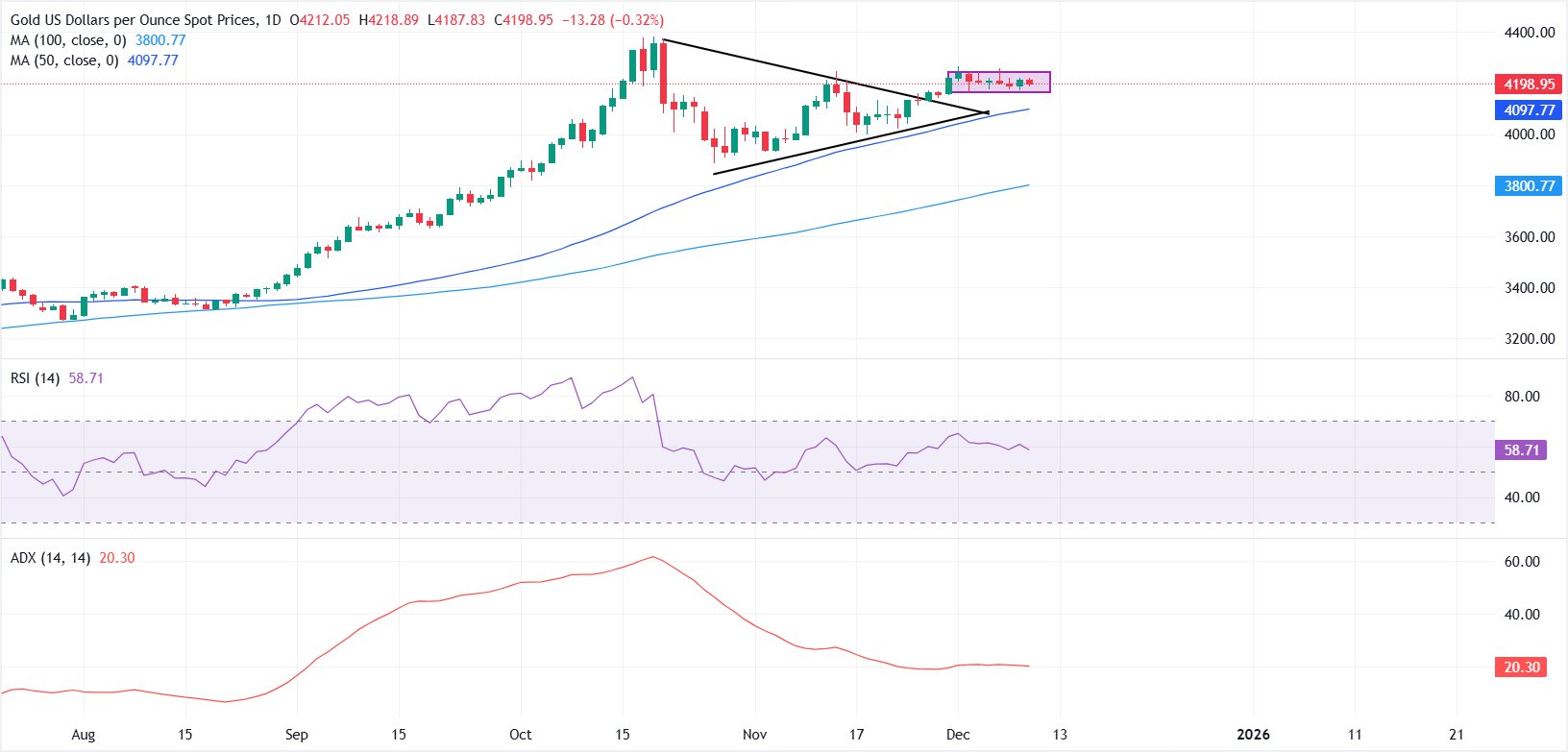 黄金(XAU/USD)在周三保持坚挺,价格走势维持在近期盘整区间内,市场为美联储(Fed)利率决策做好准备。截至发稿时,XAU/USD徘徊在4204美元附近,较日内高点4218美元有所回落