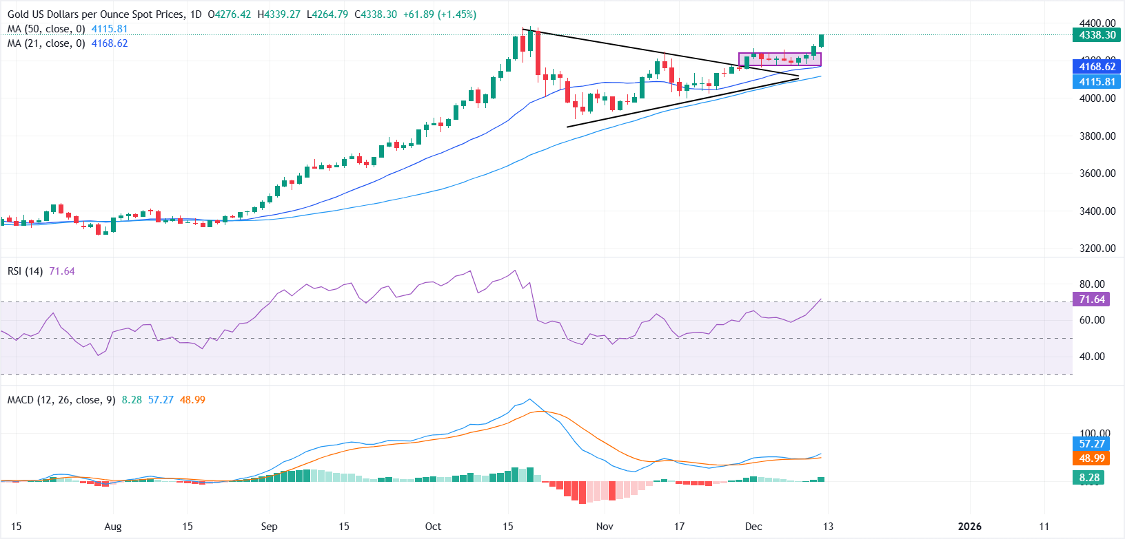 黄金(黄金/美元)在周五继续上涨,随着市场对美联储(Fed)在本周降息后进一步放松货币政策的预期不断增强。截至发稿时,黄金/美元交易在4340美元附近,距离10月20日创下的历史高点4381美元仅一步之遥。
