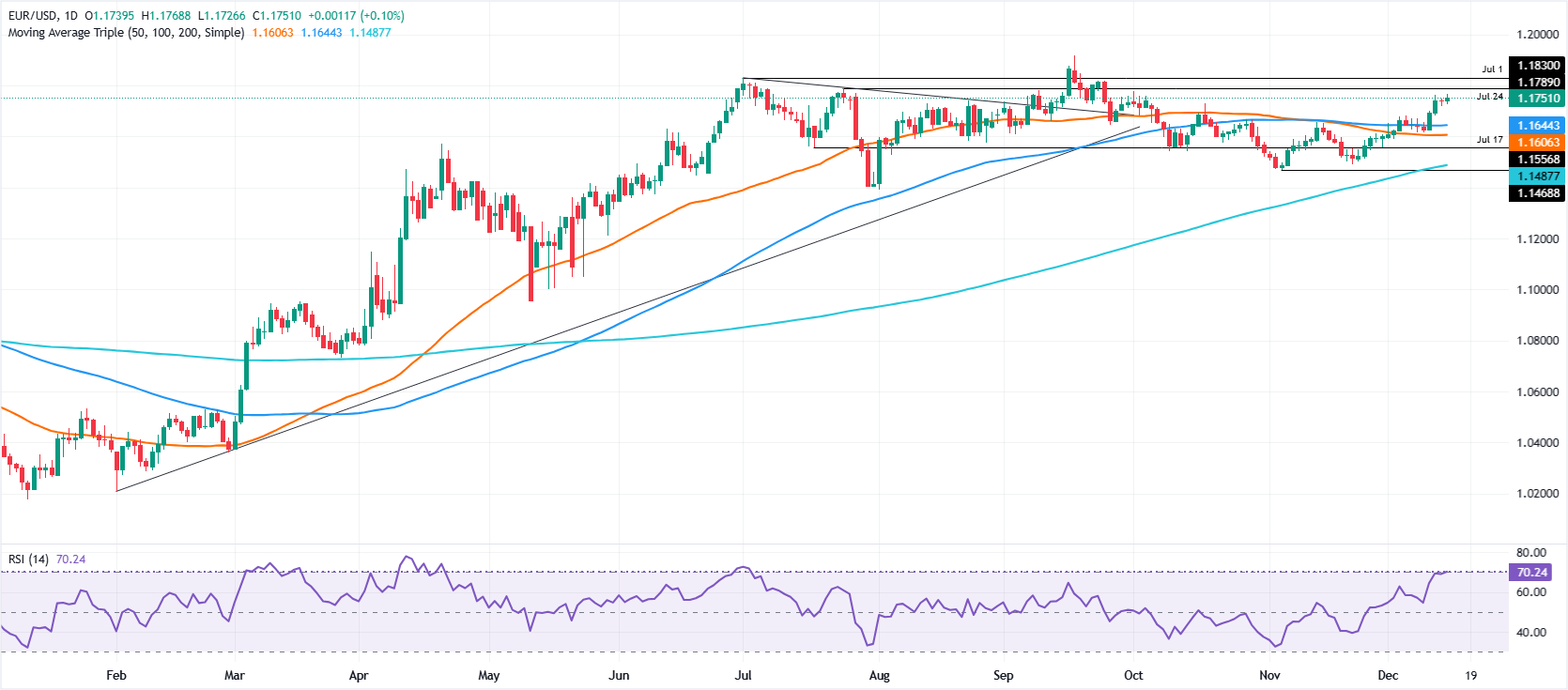 周一,欧元/美元在1.1700关口上方保持坚挺,因美元走弱,投资者在等待周二最新的非农就业报告。撰写时,该货币对交易于1.1739,持平。