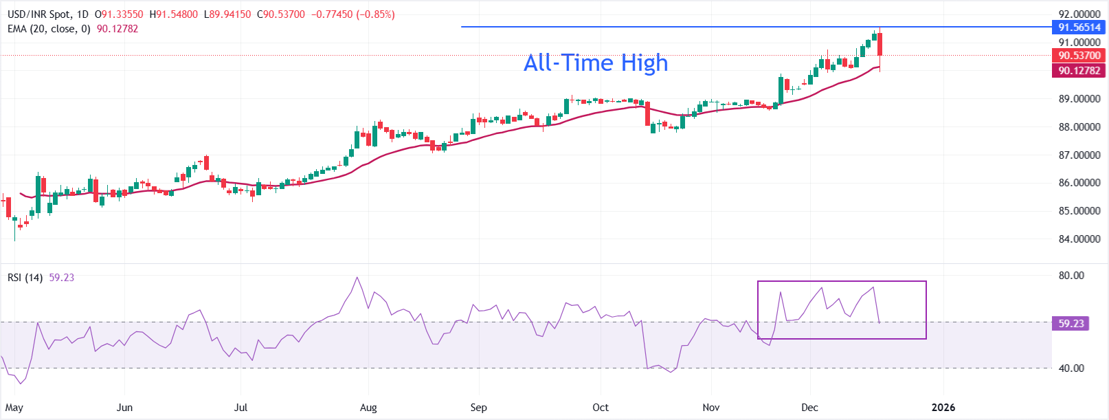 印度卢比(INR)在周三的开盘交易中对美元(USD)大幅上涨。由于印度储备银行(RBI)在现货和不可交割远期(NDF)市场的干预,美元/印度卢比(USD/INR)对近90.00的跌幅超过1%,从历史高点91.56下跌。