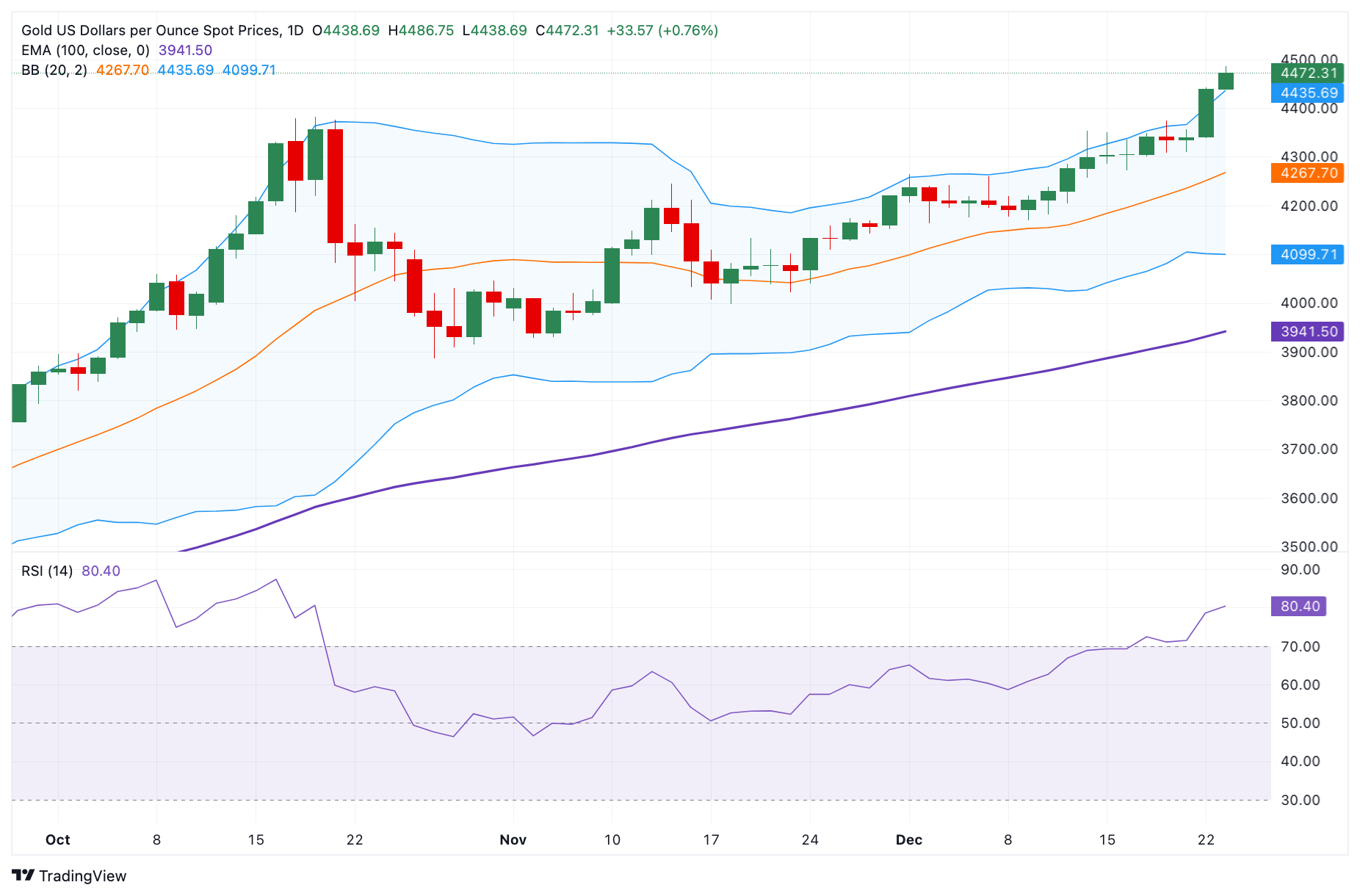 周二早盘欧洲交易时段,金价(黄金/美元)攀升至创纪录高位。由于地缘政治紧张局势加剧和经济不确定性,推动了对黄金等避险资产的需求,该贵金属在过去一个月上涨了10%,在2025年几乎上涨了70%