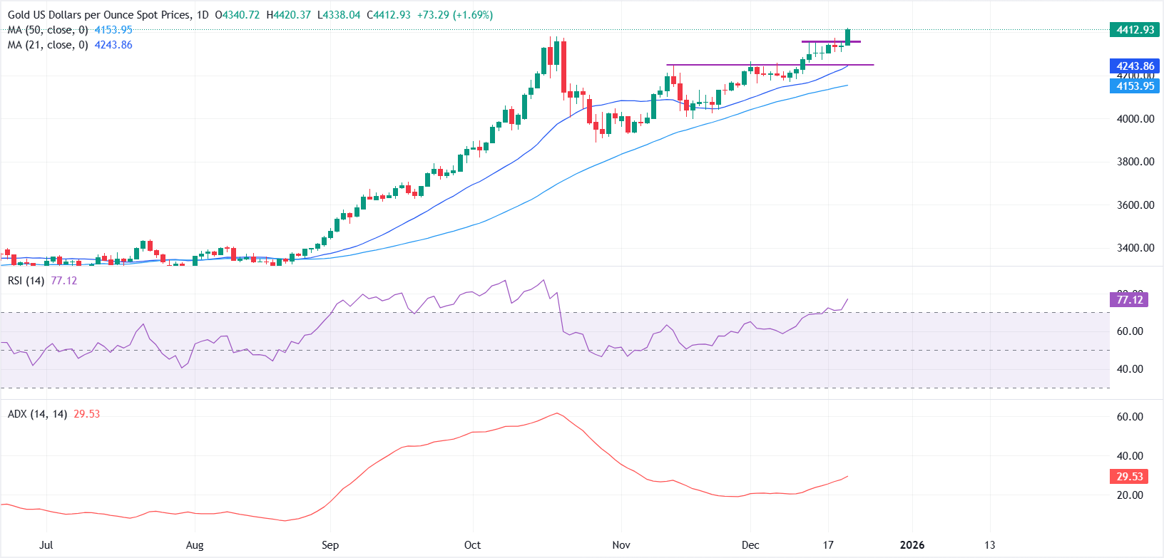 黄金(XAU/USD)周一飙升至新高,因不断升级的地缘政治紧张局势提振了避险需求。在撰写本文时,黄金/美元交投于约4424美元,日内上涨约2%,突破了10月20日接近4381美元的高点
