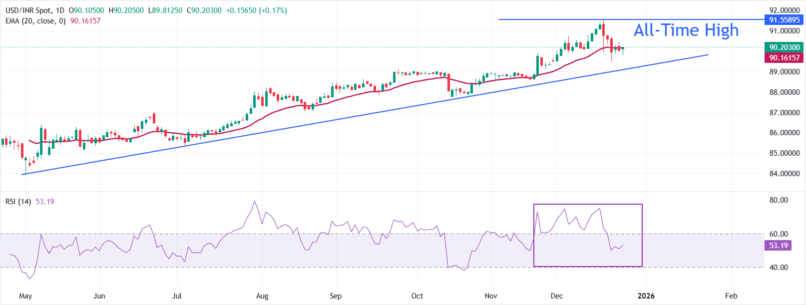 印度卢比(INR)在周三的早盘交易中兑美元(USD)小幅下跌。美元/印度卢比(USD/INR)小幅上升至接近90.16,但在印度储备银行(RBI)上周干预后,整体处于修正阶段