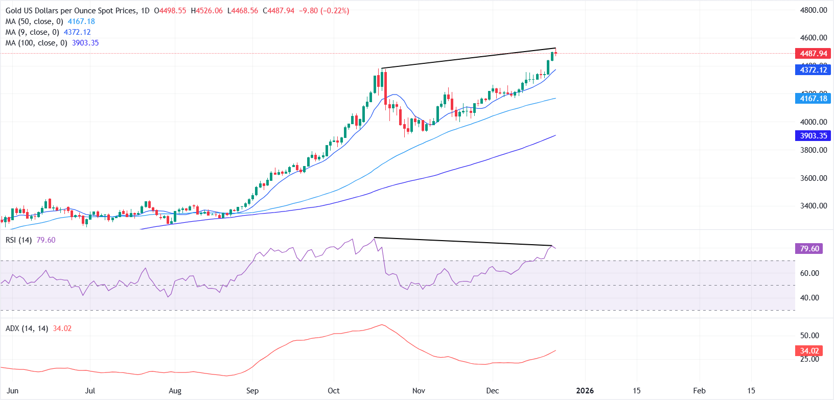 黄金(XAU/USD)周三在早些时候飙升至接近 4,526 美元的历史新高后,走势疲软。由于圣诞节前流动性稀缺,波动性加大,促使在高位出现温和的获利了结。